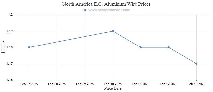 Over the preceding week, the price of E.C. Aluminum Wire dropped by 0.85% to $$1.17 per pound. According to the ScrapMonster Index, the price of 6063 Extrusions were flat on the Index. Over the course of the week, the prices of Old Cast in the Index witnessed no variation. As of February 13, 2025, UBC's prices also recorded no change to close the week at $0.80 per Lb.