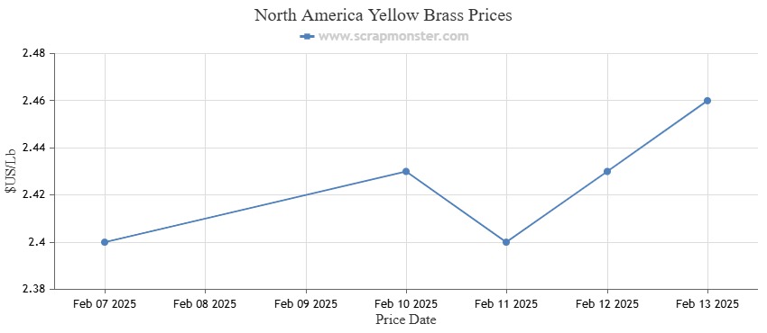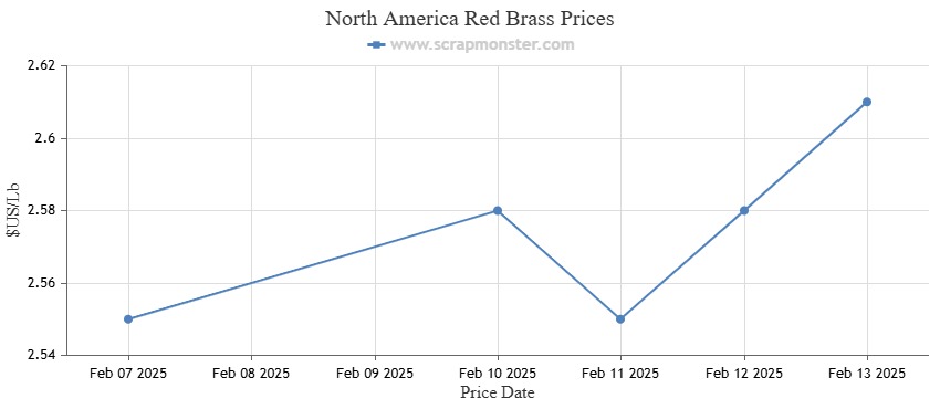Red Brass was up 2.32% from the previous week at $2.65 a pound as of Thursday, February 13, 2025. In addition, Yellow Brass's price per pound increased 2.51% over the previous week.