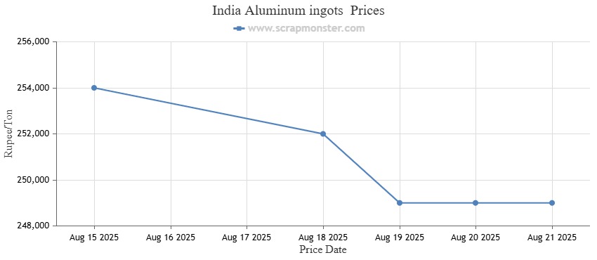 The prices of Aluminum utensil scrap saw a little decrease of 2.04%, falling from INR 245,000 per Ton to INR 240,000 a tonne during the week ending on August 21, 2025.