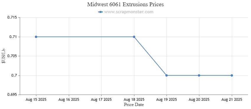 1100 Scrap, 3003 Scrap, 6063 Extrusions, 356 Aluminum Wheels (Clean), 6063 Extrusions/Fe, MLC Clips, 6063 Extrusions, E.C. Aluminum Wire, Litho Sheets, Painted Siding, 5052 Scrap, Chrome Wheels, Old Cast, Old Sheet and UBC prices reported decline over the previous week.