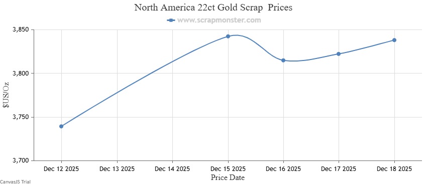 SEATTLE (Scrap Monster): The North American scrap gold, silver and platinum prices - hallmarked and non- hallmarked reported rising trend during the previous week (December 12-18, 2025) on the ScrapMonster Price Index.