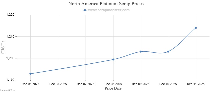 Platinum scrap finished the week at $1,213.99 per ounce, marking a 1.77 percent rise from its opening level of $1,192.84 per ounce, as depicted in the chart provided below: