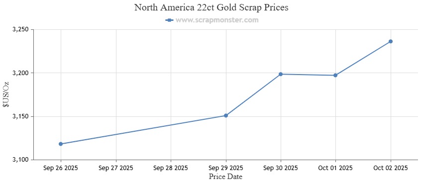 SEATTLE (Scrap Monster): The North American scrap gold, silver and platinum prices - hallmarked and non- hallmarked recorded gains during the previous week (September 26 to October 2, 2025) on the ScrapMonster Price Index.
