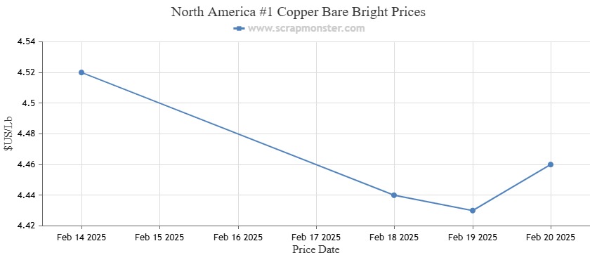 The price of #1 Copper Bare Bright on the ScrapMonster Index decreased by 1.33% for the week, from $4.52 to $4.46 per pound, as of Thursday, February 20, 2025. Over the past week, the price of #1 Copper Wire and Tubing declined from $4.42 to $4.36 per pound. By the end of the week, #2 Copper Wire and Tubing was selling for $4.26 per pound, a slight decline of 1.39%.