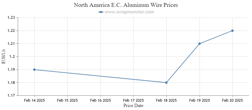 Over the preceding week, the price of E.C. Aluminum Wire jumped by 2.52% to $$1.22 per pound. According to the ScrapMonster Index, the price of 6063 Extrusions were up by 2.15% on the Index. Over the course of the week, the prices of Old Cast in the Index recorded an increase of 2.50%. As of February 20, 2025, UBC's prices also recorded a marginal increase of 2.47% to close the week at $0.83 per Lb.