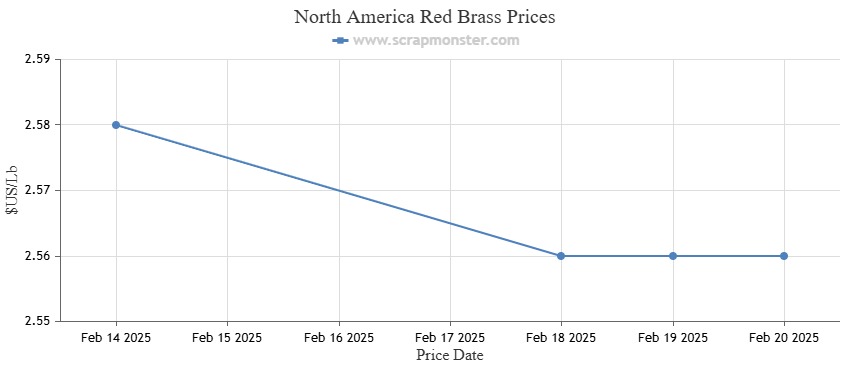 Red Brass was down 0.76% from the previous week at $2.60 a pound as of Thursday, February 20, 2025. In addition, Yellow Brass's price per pound declined 0.83% over the previous week.