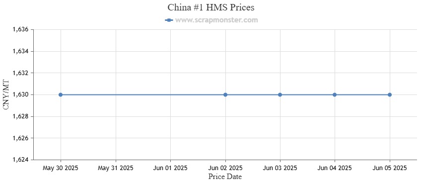 The Chinese steel scrap market remained flat during the week. The Cast Iron Scrap prices witnessed no change from the prior week. Also, #1 HMS prices held steady at CNY 1,630 per MT, as displayed in the below chart.