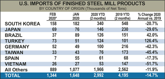 Through the first two months of 2020, total and finished steel imports are 4,655,000 and 2,992,000 NT, down 21.3 percent and 28.7 percent, respectively, vs. the same period in 2019.