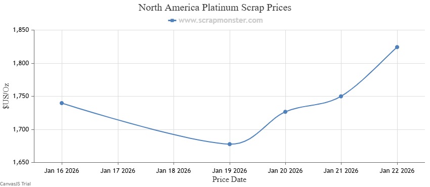 In the broader precious metals segment, silver scrap prices climbed sharply, advancing 3.93 percent to settle at $71.46 per ounce. Platinum scrap followed a similar trajectory, recording a solid increase of 4.86 percent to close the week at $1,824.27 per ounce, signalling continued strength across the precious metals scrap market.