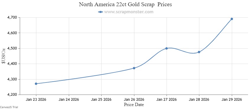 SEATTLE (Scrap Monster): North American precious metal scrap prices, including gold, silver, and platinum in both hallmarked and non-hallmarked forms, posted strong gains on the ScrapMonster Price Index during the January 23–29, 2026 period.
