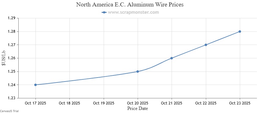 The price of E.C. Aluminum Wire on the Scrap Monster Price Index rose by $0.04 per pound as of Thursday, October 23, 2025, a weekly increase of ↑3.23%. 6063 Extrusions went higher by $0.02 per pound, recording an increase by ↑2.08% from the prior week. By the end of the week, the price of Old Cast had increased by ↑2.44% to $0.02 more per pound. Also, UBC prices recorded week-on-week jump by ↑2.41%