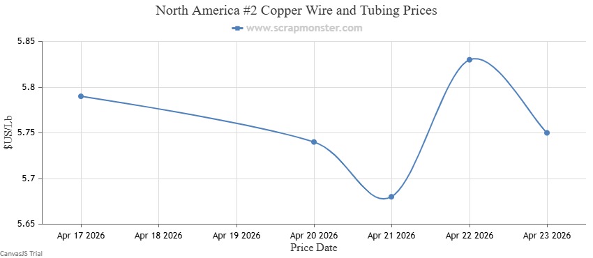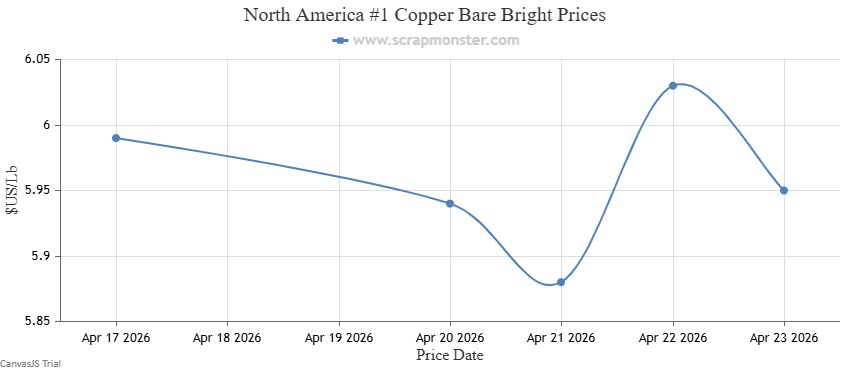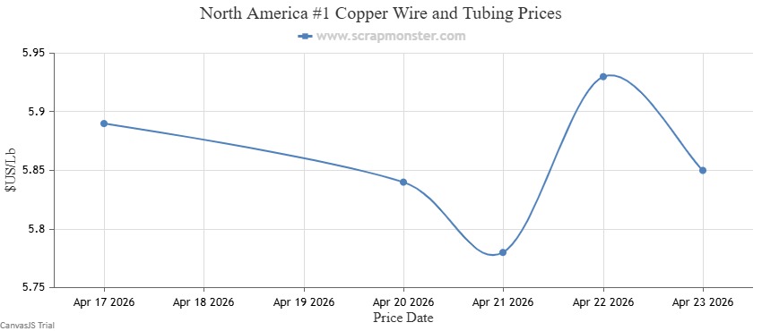 The price of #1 Copper Bare Bright on the Scrap Monster Price Index edged lower by $0.04 per pound as of Thursday, April 23, 2026, a weekly decline of ↓0.69%. #1 Copper Wire & Tubing reported a decline by $0.04 per pound, registering a dip by ↓0.70% from the prior week. By the end of the week, the price of #2 Copper Wire and Tubing had dropped by $0.04 (↓0.71%).