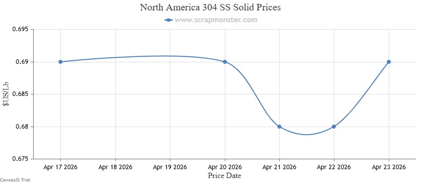 The price of 304 SS Solid on the Scrap Monster Price Index recorded no change as of Thursday, April 23, 2026.