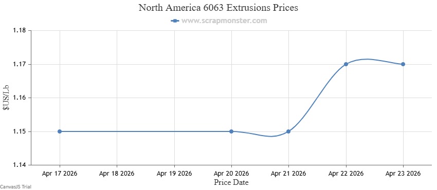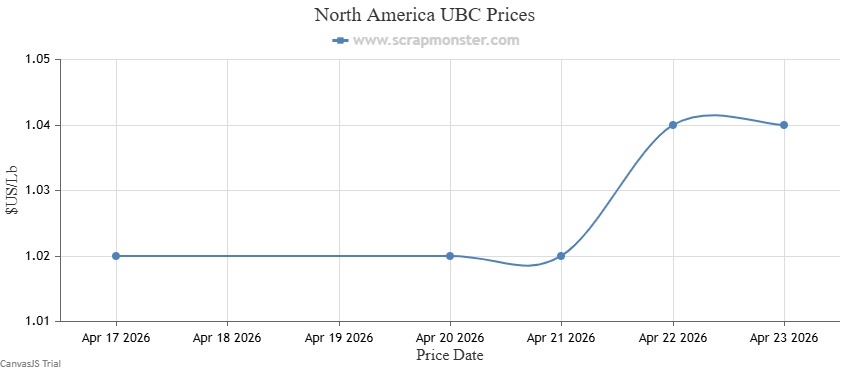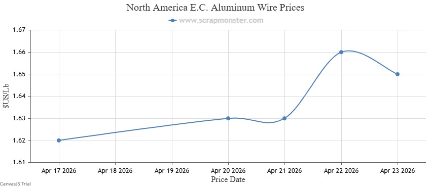 The price of E.C. Aluminum Wire on the Scrap Monster Price Index recorded a jump of $0.03 per Lb (↑1.85%) as of Thursday, April 23, 2026. 6063 Extrusions edged higher by $0.02 per Lb compared with the previous week. Old Cast prices increased from the previous week's closing price, rising by $0.02 per Lb (↑1.98%) during the week, while UBC prices also increased by $0.02 per Lb on a week-on-week basis.