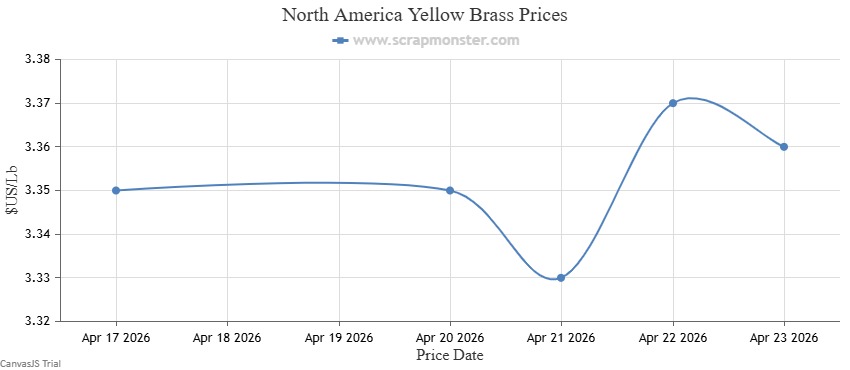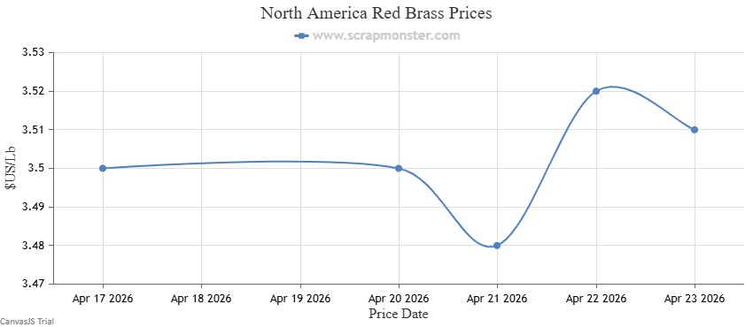 On the Scrap Monster Price Index, Red Brass prices rose by $0.01 per Lb as of Thursday, April 23, 2026. Yellow Brass also posted gains, increasing by $0.01 per Lb on the Index.