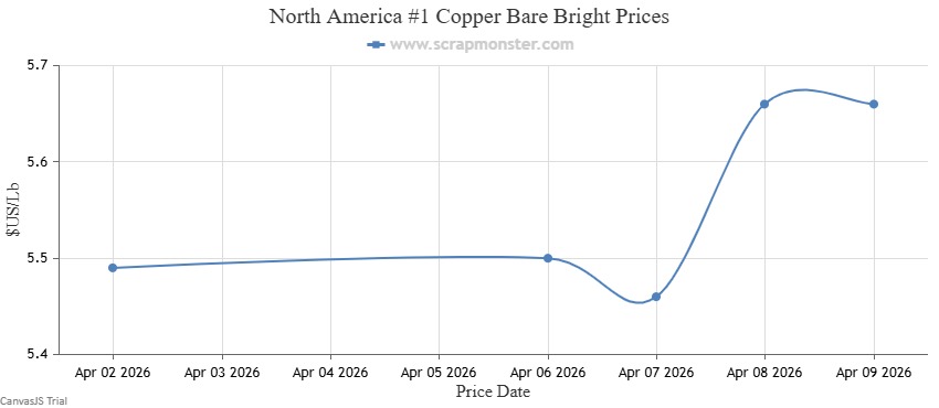 The price of #1 Copper Bare Bright on the Scrap Monster Price Index inched up by $0.17 per pound as of Thursday, April 9, 2026, a weekly jump of ↑3.21%. #1 Copper Wire & Tubing edged higher by $0.17 per pound, registering an increase by ↑3.27% from the prior week. By the end of the week, the price of #2 Copper Wire and Tubing had edged higher by ↑3.33%.