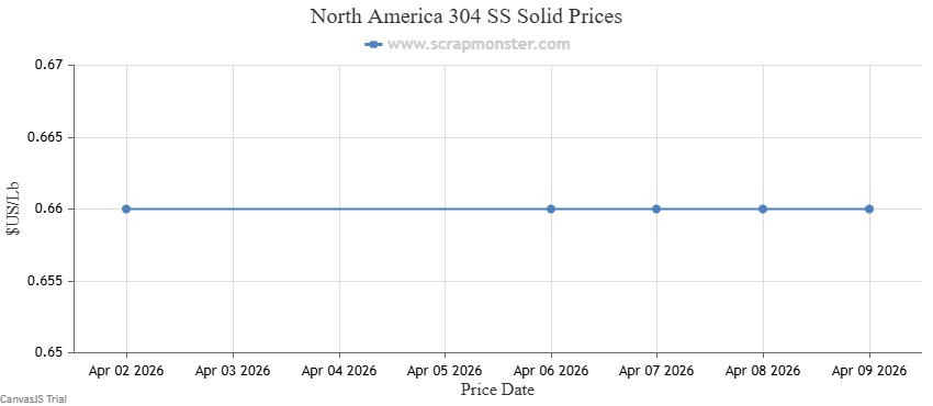 The price of 304 SS Solid on the Scrap Monster Price Index recorded no change as of Thursday, April 9, 2026.