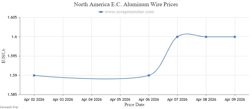 The price of E.C. Aluminum Wire on the Scrap Monster Price Index recorded a jump of ↑0.63% as of Thursday, April 9, 2026. 6063 Extrusions recorded no change compared with the previous week. Old Cast prices held steady from the previous week's closing price, while UBC prices also were flat on a week-on-week basis.