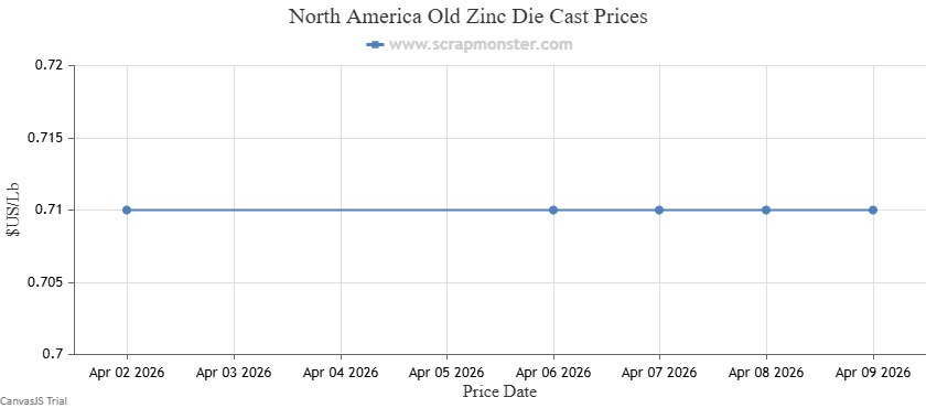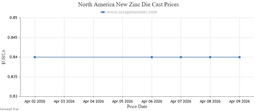 The price of New Zinc Die Cast on the Scrap Monster Price Index recorded no variation as of Thursday, April 9, 2026. Also, Old Zinc Die Cast prices were flat over the previous week.