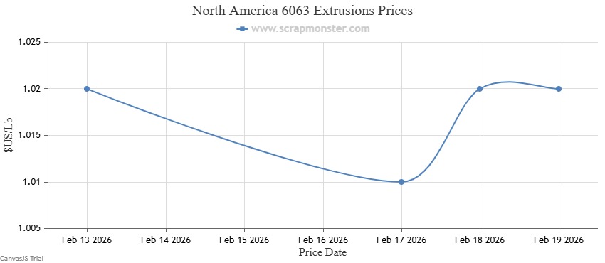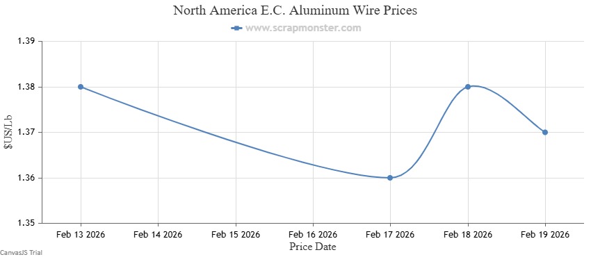 The price of E.C. Aluminum Wire on the Scrap Monster Price Index recorded a dip of ↓0.72% as of Thursday, February 19, 2026. 6063 Extrusions were unchanged upon comparison with the prior week. By the end of the week, the price of Old Cast witnessed no variation. Also, UBC prices recorded no fluctuation week-on-week.