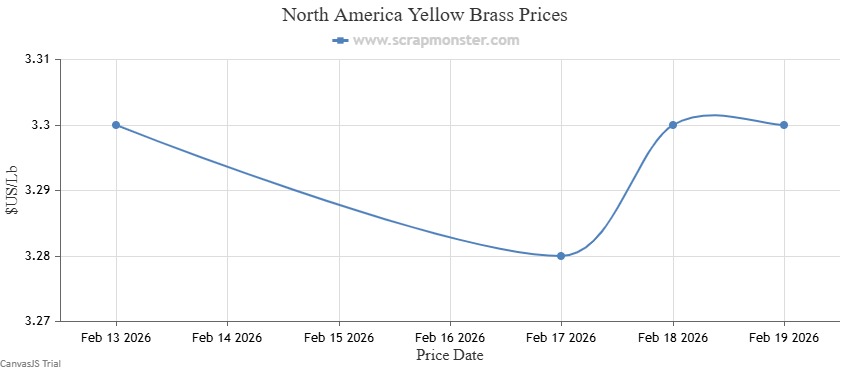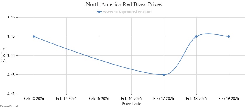 The price of Red Brass on the Scrap Monster Price Index recorded no fluctuation as of Thursday, February 19, 2026. Yellow Brass prices also recorded no variation in prices.