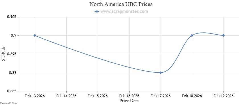 The price of E.C. Aluminum Wire on the Scrap Monster Price Index recorded a fall of ↓0.72% as of Thursday, February 19, 2026. 6063 Extrusions remained flat, compared with the previous week. Old Cast prices were flat during the week. Additionally, UBC prices held steady on a week-on-week basis.