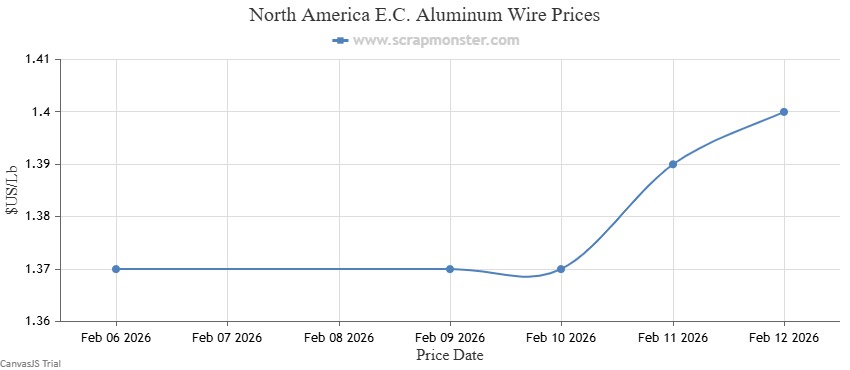 The price of E.C. Aluminum Wire on the Scrap Monster Price Index recorded a jump of ↑2.19% as of Thursday, February 12, 2026. 6063 Extrusions were up by ↑0.98% upon comparison with the prior week. By the end of the week, the price of Old Cast witnessed a rise of ↑1.11%. Also, UBC prices increased by ↑1.10% week-on-week.