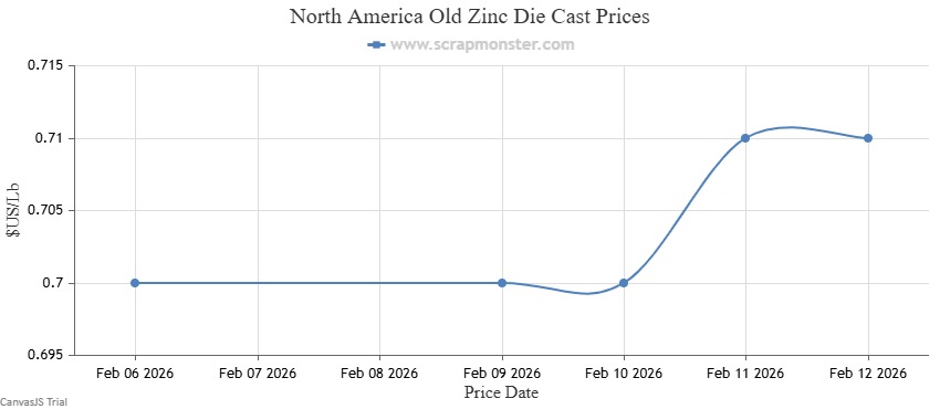 The price of New Zinc Die Cast on the Scrap Monster Price Index recorded an incresae of ↑1.20% as of Thursday, February 12, 2026. Also, Old Zinc Die Cast prices were up by ↑1.43% over the previous week.