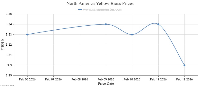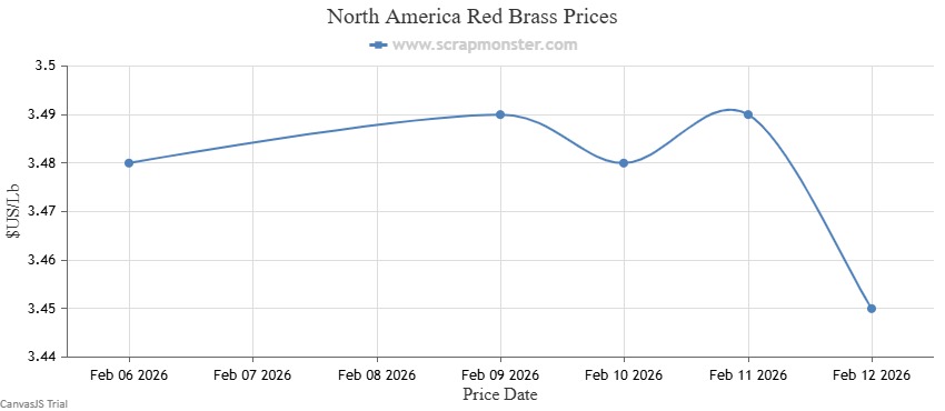 The price of Red Brass on the Scrap Monster Price Index recorded a decline of ↓0.86% as of Thursday, February 12, 2026. Yellow Brass prices also witnessed a fall of ↓0.90% in prices over the previous week's prices.