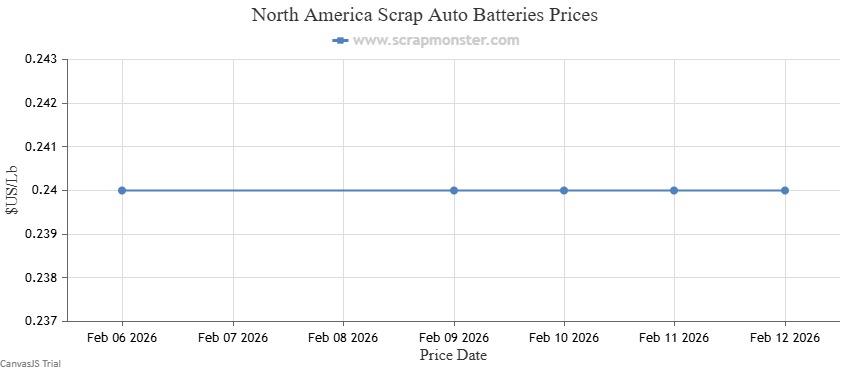 The prices of Scrap Auto Batteries recorded no change on the Scrap Monster Price Index as of Thursday, February 12, 2026.