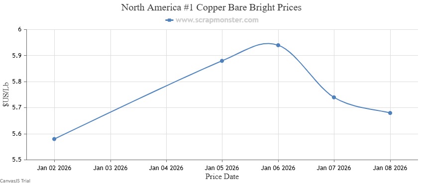 The price of #1 Copper Bare Bright on the Scrap Monster Price Index increased by $0.10 per pound as of Thursday, January 8, 2026, a weekly jump of ↑1.79%. #1 Copper Wire & Tubing went higher by $0.10 per pound, registering an increase by ↑1.82% from the prior week. By the end of the week, the price of #2 Copper Wire and Tubing had recorded a rise by ↑1.86% , moving from $5.38 per pound to $5.48 per pound on the Index.