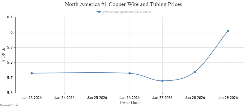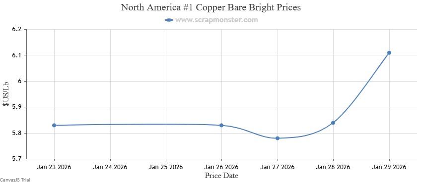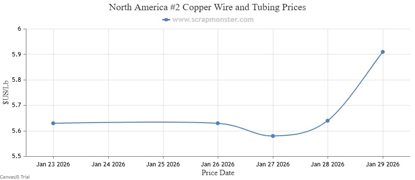 The price of #1 Copper Bare Bright on the Scrap Monster Price Index increased by $0.28 per pound as of Thursday, January 29, 2026, a weekly jump of ↑4.80%. #1 Copper Wire & Tubing went higher by $0.28 per pound, registering an increase by ↑4.89% from the prior week. By the end of the week, the price of #2 Copper Wire and Tubing had recorded a rise by ↑4.97% , moving higher by $0.28 per pound on the Index.