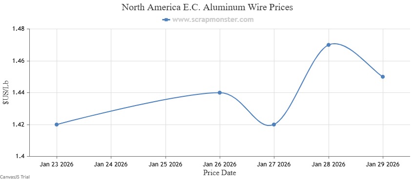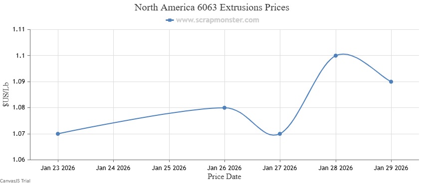 The price of E.C. Aluminum Wire on the Scrap Monster Price Index recorded an increase of 2.11% as of Thursday, January 29, 2026. 6063 Extrusions were up by 1.87%, upon comparison with the prior week. By the end of the week, the price of Old Cast increased by $0.02 per Lb. Also, UBC prices recorded a week-on-week jump by 2.13%.