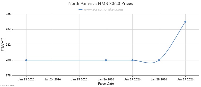 #1 HMS’s price on the Scrap Monster Price Index recorded 2.82% surge as of Thursday, January 29, 2026. Shredded Auto Scrap witnessed a jump of 3.75% during the week. By the end of the week, the price of HMS 80/20 had increased by 1.79%. #1 Busheling prices also edged higher by 1.23% over the previous week.