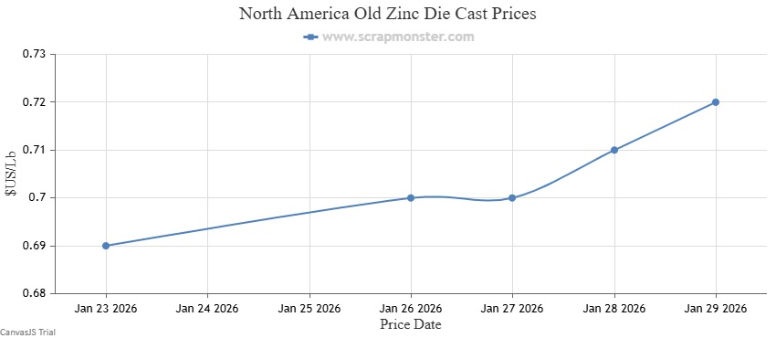 The price of New Zinc Die Cast on the Scrap Monster Price Index recorded a jump by 3.66% as of Thursday, January 29, 2026. Also, Old Zinc Die Cast prices were up by 4.35% over the previous week.