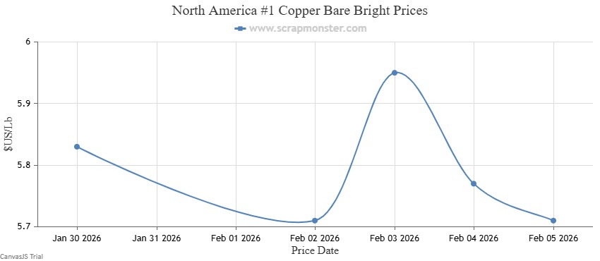 #1 Copper Bare Bright’s prices on the Scrap Monster Price Index dropped by $0.12 per pound as of Thursday, February 5, 2026, a weekly fall of ↓2.04%. #1 Copper Wire & Tubing inched lower by $0.12 per pound, registering a decline by ↓2.08% from the prior week. #2 Copper Wire and Tubing prices had recorded a dip of ↓2.11% as at the end of the week.