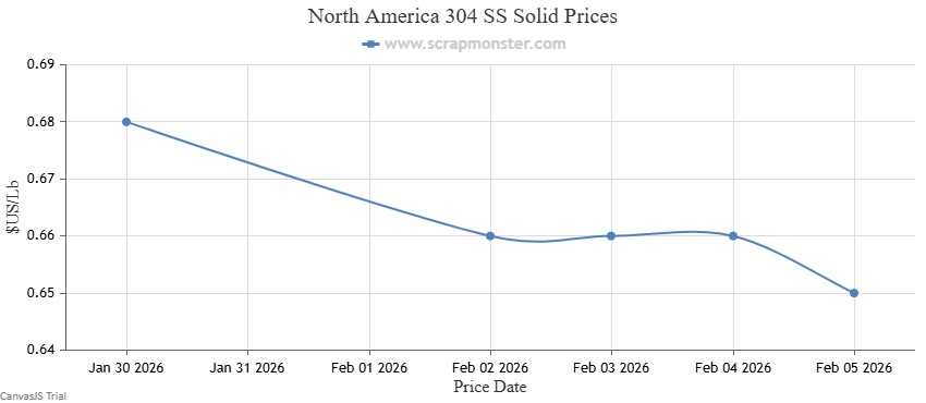 The price of 304 SS Solid on the Scrap Monster Price Index recorded a downward movement, dropping by $0.02 per Lb during the week ended Thursday, February 5, 2026.