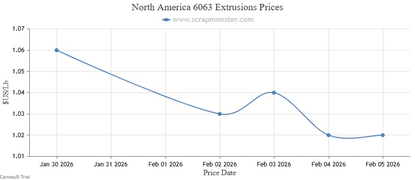 North America Aluminum Scrap Prices: Over the previous week, E.C. Aluminum Wire recorded a dip of ↓3.55% in prices. The prices of the commodity edged lower modestly by $0.05 per Lb on the Scrap Monster Price Index at the close of the week. 6063 Extrusions ended the week recording a decline of ↓3.77% from the prior week. Old Cast prices were down by ↓3.26% during the week. Also, UBC prices fell by ↓3.23% over the previous week's prices.