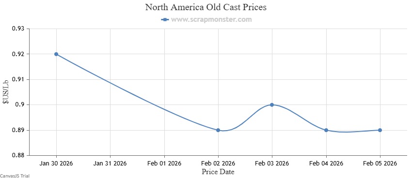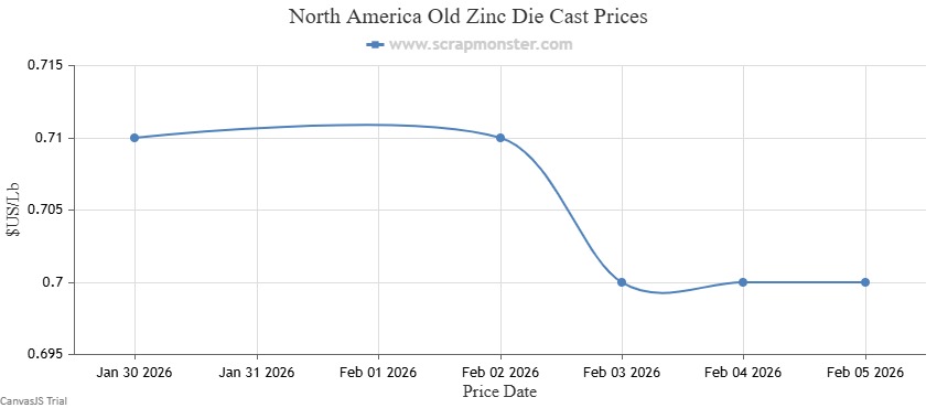 The price of New Zinc Die Cast on the Scrap Monster Price Index recorded a decline of ↓1.19% as of Thursday, February 5, 2026. Also, Old Zinc Die Cast prices were down by ↓1.41% over the previous week.