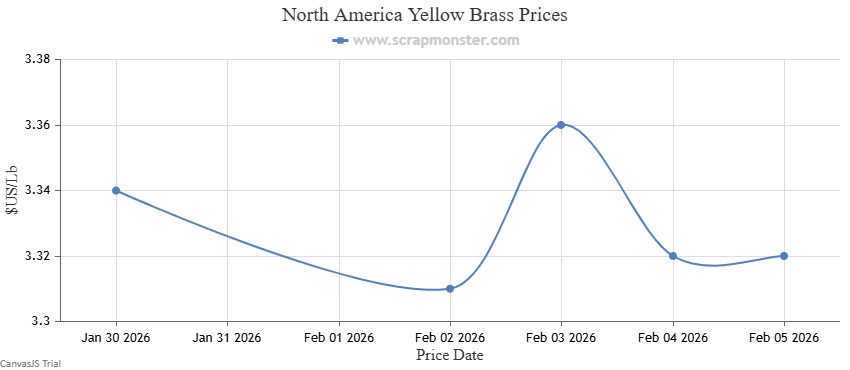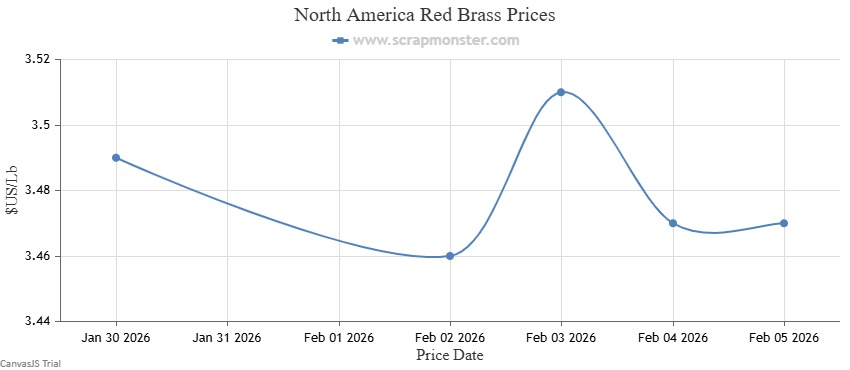 The price of Red Brass on the Scrap Monster Price Index recorded a decline of ↓0.57% as of Thursday, February 5, 2025. Yellow Brass prices also witnessed a fall of ↓0.60% in prices over the previous week's prices.