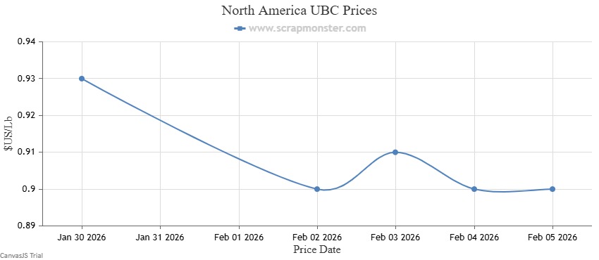 The price of E.C. Aluminum Wire on the Scrap Monster Price Index recorded a fall of ↓3.55% as of Thursday, February 5, 2026. 6063 Extrusions prices witnessed a decline of ↓3.77%, compared with the previous week. Old Cast prices were down by ↓3.26% during the week. Additionally, UBC prices saw a dip of ↓3.23% on a week-on-week basis.