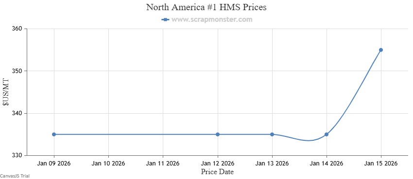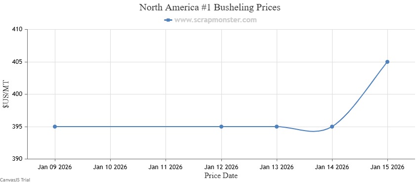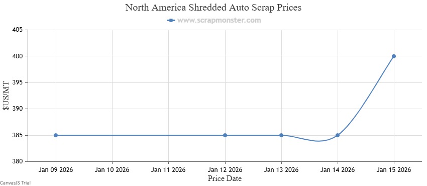 #1 HMS’s price on the Scrap Monster Price Index was up by 5.97% as of Thursday, January 15, 2026. Shredded Auto Scrap witnessed a jump of 3.90%, closing the at $400 per MT. By the end of the week, the price of HMS 80/20 had increased by 3.70%. #1 Busheling prices also edged higher by 2.53% over the previous week.