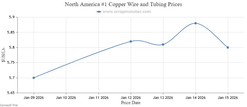 The price of #1 Copper Bare Bright on the Scrap Monster Price Index inched up by $0.10 per pound as of Thursday, January 15, 2026, a weekly jump of ↑1.79%. #1 Copper Wire & Tubing edged higher by $0.10 per pound, registering an increase by ↑1.82% from the prior week. By the end of the week, the price of #2 Copper Wire and Tubing had edged higher by ↑1.85% to close the week at $5.50 per pound.