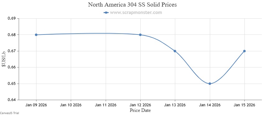 The price of 304 SS Solid on the Scrap Monster Price Index recorded a downward movement, dropping by $0.01 per Lb to $0.67 per pound during the week ended Thursday, January 15, 2026.