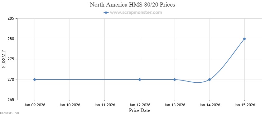 The price of #1 HMS on the Scrap Monster Price Index reported an increase of $20 per metric ton as of Thursday, January 15, 2026. Shredded Auto Scrap prices were up by $15 per metric ton on the Index upon comparison with the prior week. By the end of the week, the price of HMS 80/20 had recorded 3.70% jump. #1 Busheling prices also were up by 2.53% over the previous week.