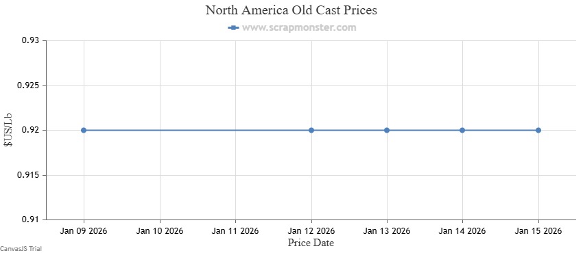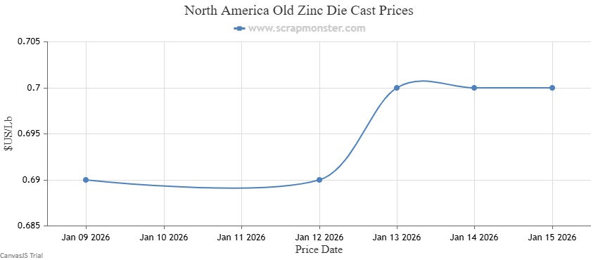 The prices of New Zinc Die Cast witnessed week-over-week jump of 1.22% on the Scrap Monster Price Index as of Thursday, January 15, 2026. Similarly, the Old Zinc Die Cast prices closed at $0.70 per Lb, higher by 1.45% week-over-week.