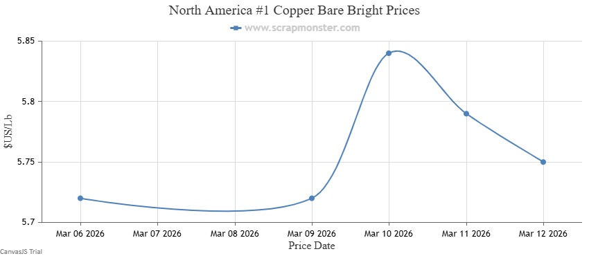 #1 Copper Bare Bright’s prices on the Scrap Monster Price Index increased by $0.03 per pound as of Thursday, March 12, 2026, a weekly increase of ↑0.51%. #1 Copper Wire & Tubing inched higher by $0.03 per pound, registering a jump by ↑0.52% from the prior week. #2 Copper Wire and Tubing prices had recorded an increase by ↑0.53% as at the end of the week.