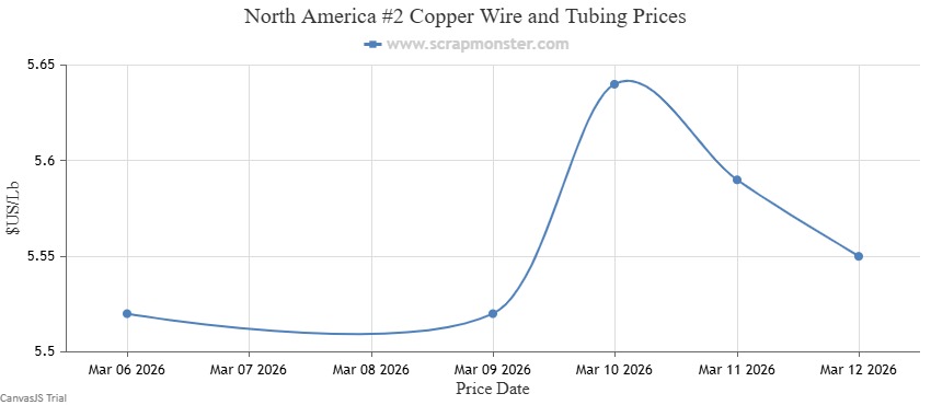 The price of #1 Copper Bare Bright on the Scrap Monster Price Index inched up by $0.03 per pound as of Thursday, March 12, 2026, a weekly jump of ↑0.54%. #1 Copper Wire & Tubing edged higher by $0.03 per pound, registering an increase by ↑0.55% from the prior week. By the end of the week, the price of #2 Copper Wire and Tubing had edged higher by ↑0.56%.