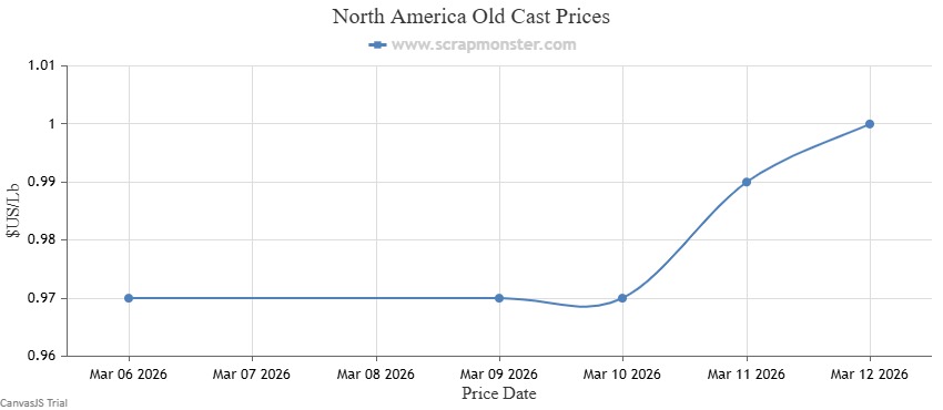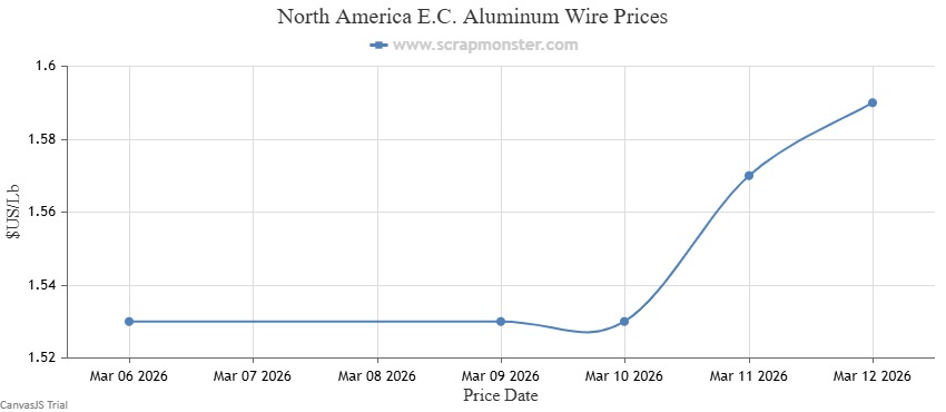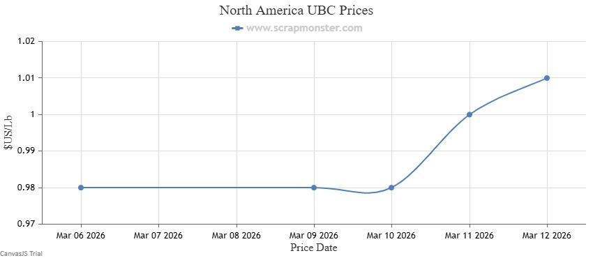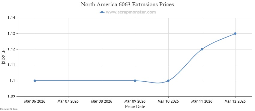 The price of E.C. Aluminum Wire on the Scrap Monster Price Index recorded a jump of ↑3.92% as of Thursday, March 12, 2026. 6063 Extrusions edged higher by ↑2.73% compared with the previous week. Old Cast prices increased from the previous week's closing price of $0.97, edging higher by ↑3.09% during the week, while UBC prices also increased by ↑3.06% on a week-on-week basis.