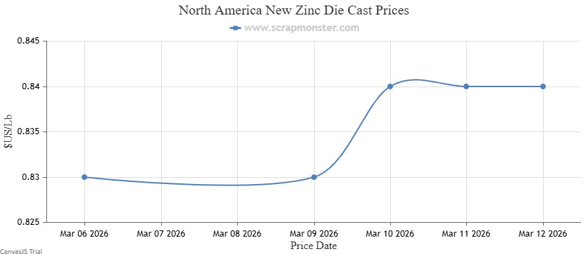 The price of New Zinc Die Cast on the Scrap Monster Price Index recorded a jump by ↑1.20% as of Thursday, March 12, 2026. Also, Old Zinc Die Cast prices were up by ↑1.43% over the previous week.